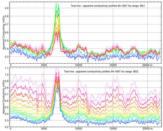 Apparent conductivity profiles along the test survey line in the 84–1067 Hz range (12 frequency windows), calculated for each frequency using BS1 (top) and BS2 (bottom). Blue—low frequencies, pink—high frequencies.