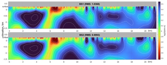 All apparent resistivity curves collected along the test line, which extends for more than 20 km, are presented in Figure 6, grouped into two sets corresponding to BS1 and BS2. The differences in curve shapes, particularly at higher frequencies, reflect variations in the near-surface geoelectrical conditions at the two base stations. BS2, located in a more conductive environment, results in generally lower apparent resistivities and altered curve shapes. These variations illustrate the sensitivity of the airborne system to shallow base station effects, which are subsequently minimized during inversion.