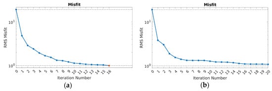 Inversion using the broadband dataset (with HF) converged more rapidly, achieving the target root-mean-square (RMS) misfit by iteration 16 (Figure 9a). In contrast, the inversion without high frequencies failed to converge within the iteration limit, suggesting slower and less stable inversion performance when HF data are excluded (Figure 9b).