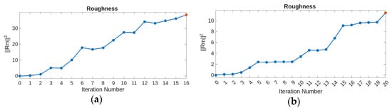 Roughness versus iteration number for the inversion processes including high-frequency data (a) and excluding high-frequency data (b).