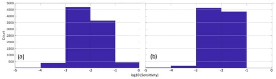 Figure 11a,b plot the distributions of log10 (Sensitivity) for the same MobileMT test survey line as follows: