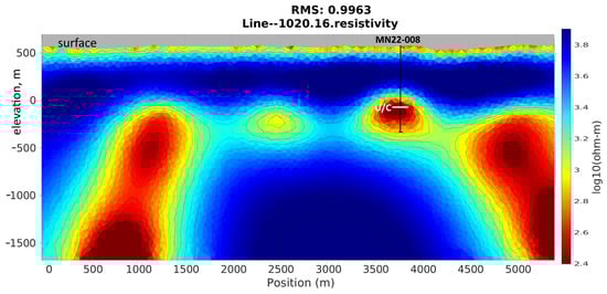 Considering the advantages outlined above, MobileMT surveys have proven effective in detecting both near-surface and deep-seated geoelectrical features, conductive and resistive, across various geologic environments and for variety of commodities, such as magmatic sulfide systems and VMS [], polymetallic epithermal systems [], unconformity-related uranium controlling structures [,], kimberlite pipes [], porphyry-style systems [], sedimentary copper [], and orogenic gold [].