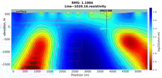 Because the vertical component of the total magnetic field is typically much weaker than the horizontal components in most survey situations and only becomes significant in the presence of strongly 2D structures with linear current systems or pronounced 3D effects, MobileMT data inversion is generally based on the determinant of the 2 × 2 admittance tensor formed from the horizontal field components (as described in [,,]). In this context, the apparent conductivity values, as they relate to frequencies, the main output of MobileMT surveys, can then be inverted using conventional MT inversion algorithms, modified to accommodate the spatial separation between the airborne moving sensor and the fixed position of the reference base station.