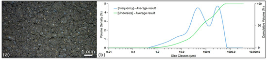 The particle size distribution (PSD) of the sample was analyzed with the use of a Malvern Mastersizer 3000 laser diffraction analyzer (Malvern Instruments Ltd., Malvern, Worcestershire, UK). Each sample underwent five separate measurements, and the final particle size distribution was obtained by averaging the results from all 25 measurements.