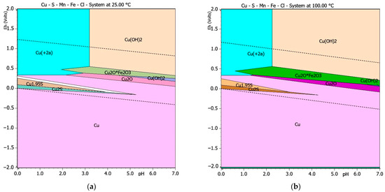 Predicted the Pourbaix Eh–pH diagrams of CuFeS2 leaching in an aqueous solution of HCl with MnO2 as an oxidizing agent: the Cu-Fe-S-Mn-Cl-H2O system at a temperature of 25 °C (a); the Cu-Fe-S-Mn-Cl-H2O system at a temperature of 100 °C (b). Note: the dotted lines mark the water stability boundaries.