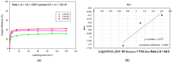 The leaching behavior of chalcopyrite concentrates under microwave irradiation at 750 W, in the presence of DSP nodules and at a liquid-to-solid (L/S) ratio of 16:1, is shown in Figure 4a. The leaching profiles exhibit hyperbolic trends for HCl concentrations of 2, 3, and 5 M, with copper extraction proceeding most rapidly within the first 5 min. The initial phase, up to 40 min, represents the most efficient leaching interval, with the maximum copper recovery (~40%) observed for 5 M HCl. Increasing the acid concentration beyond this point does not significantly enhance extraction efficiency.