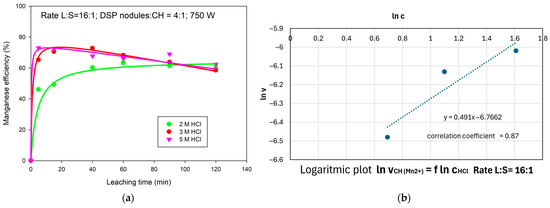 Figure 5a presents manganese recovery during leaching at a L/S ratio of 16:1 under microwave irradiation at 750 W. The curve (2M HCl) exhibits a typical hyperbolic trend, with a rapid initial increase in manganese recovery. The curves (3M HCl and 5M HCl) have an increasing trend; however, at 40 min, there is a gradual stabilization or decrease over time. At a HCl concentration of 2 M, manganese recovery remains relatively low; however, significantly higher recoveries are achieved at 3 M and 5 M HCl. Within the first 5 min of leaching, the difference in manganese extraction between the 2 M solution and higher acid concentrations reaches up to 30%.
