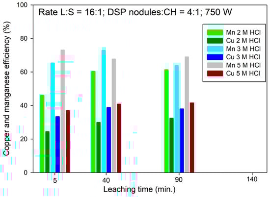 Comparison of Cu and Mn recovery at different HCl concentrations of 5, 40, and 90 minutes of leaching at 750 W and S/L ratio 16:1.