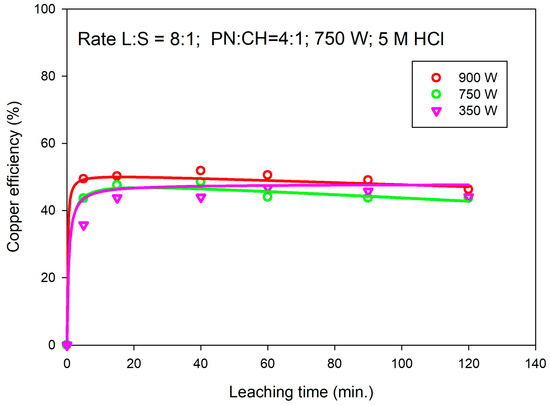 The effect of microwave (MW) power on copper recovery was investigated across a range of power levels: 350 W, 750 W, and 900 W. Copper recoveries at different MW power settings are shown in Figure 7, at a L/S ratio of 16:1 under microwave irradiation at 750 W and concentration 5 M HCl.
