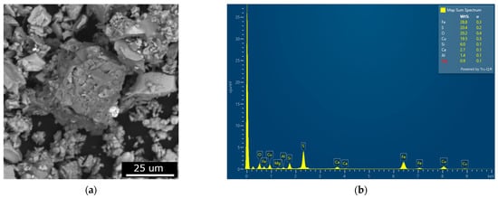 Figure 8a,b present the SEM and EDX analysis of the solid residue after leaching the chalcopyrite concentrate (leaching condition at 750 W, 5 M HCl and L/S ratio of 8:1). Surface analysis of the mineral reveals the absence of an elemental sulfur layer, which is commonly observed during conventional leaching in media such as HCl, H2SO4, or iodized salts, as reported in previous studies [46,47]. This suggests that microwave (MW) irradiation applied during chalcopyrite leaching disrupts the formation and accumulation of this passivating sulfur layer on the mineral surface.