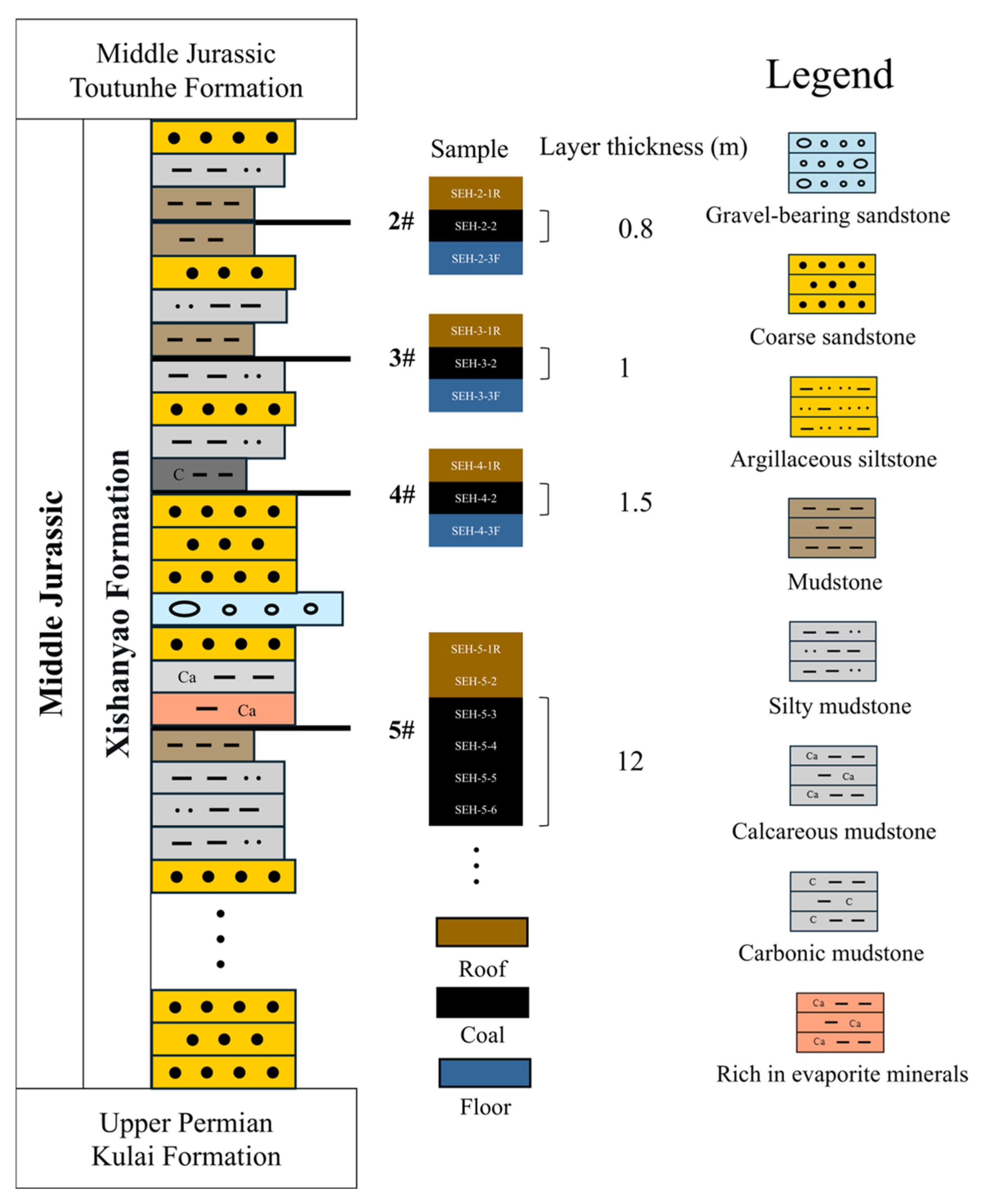 The Upper Permian Kule Formation is distributed in the northern part of the mining area and comprises a lacustrine–fluvial clastic sequence dominated by gray-yellow to gray-green calcareous sandstones, conglomerates, and silty mudstones, intercalated with minor black shale, stacked limestone, and limonite lenses. It contains abundant plant fossils and silicified wood. This formation unconformably overlies the underlying Albazai Formation and is in turn unconformably overlain by Jurassic strata. The Middle Jurassic Xishanyao Formation reaches a maximum thickness of 617.34 m, with an average thickness of approximately 475.6 m, and rests unconformably on the underlying strata and middle Variscan intrusive rocks. Based on lithological characteristics and depositional cycles, the Xishanyao Formation can be subdivided into lower, middle, and upper lithofacies units. The lower and upper units are mainly composed of fluvial–lacustrine clastic deposits with limited coal development, whereas the middle unit constitutes the main coal-bearing section, with a thickness ranging from 32.89 to 318.40 m, comprising 2–34 coal seams. Individual coal seam thickness generally exceeds 0.3 m, with an average cumulative thickness of 91.62 m. The dominant lithologies include interbedded gray-white siltstones, sandstones, and thick black coal seams, with intercalations of light gray-green mudstone in the upper part and gray-black carbonaceous mudstone and siderite-rich thin layers in the lower part. The coal seams investigated in this study include Seams 2, 3, 4, and 5 of the middle unit, which are relatively stable and representative of the formation. The lithological assemblage reflects the energy variations and redox fluctuations of a lacustrine–peat mire depositional system [22].