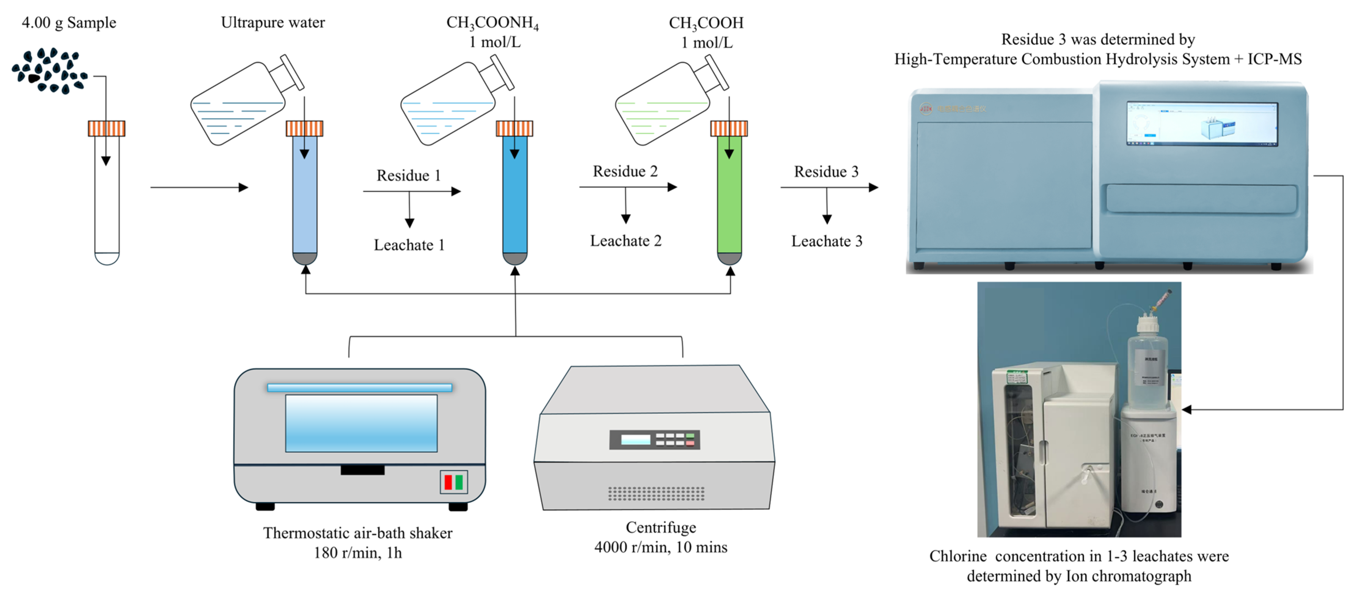 Figure 3. Flow diagram of the sequential chemical extraction procedure (SCEP) and high-temperature combustion-hydrolysis (HTCH) for chlorine speciation.