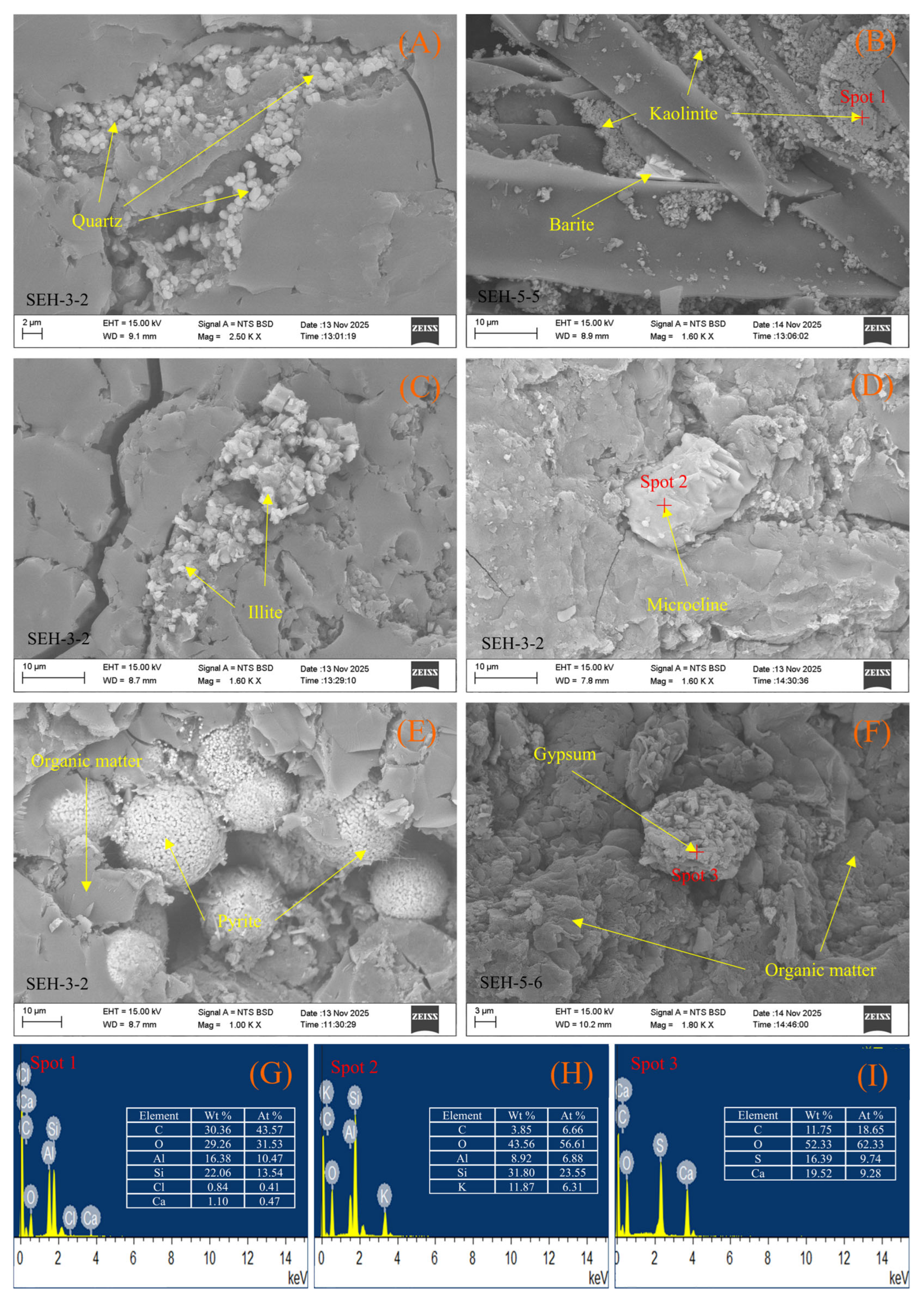 Figure 4. Backscattered electron (BSE) images and selected-point EDS spectra of minerals in the coal samples. (A) Quartz filling microfractures; (B) kaolinite occurring as fracture infillings; (C) illite intergrown with organic matter; (D) plagioclase embedded within the coal matrix; (E) pyrite occurring as euhedral grains and framboidal forms within the coal matrix; (F) gypsum occurring among fragments of the coal matrix; (G), (H) and (I) EDS spectra of Spot 1, Spot 2, and Spot 3, respectively.