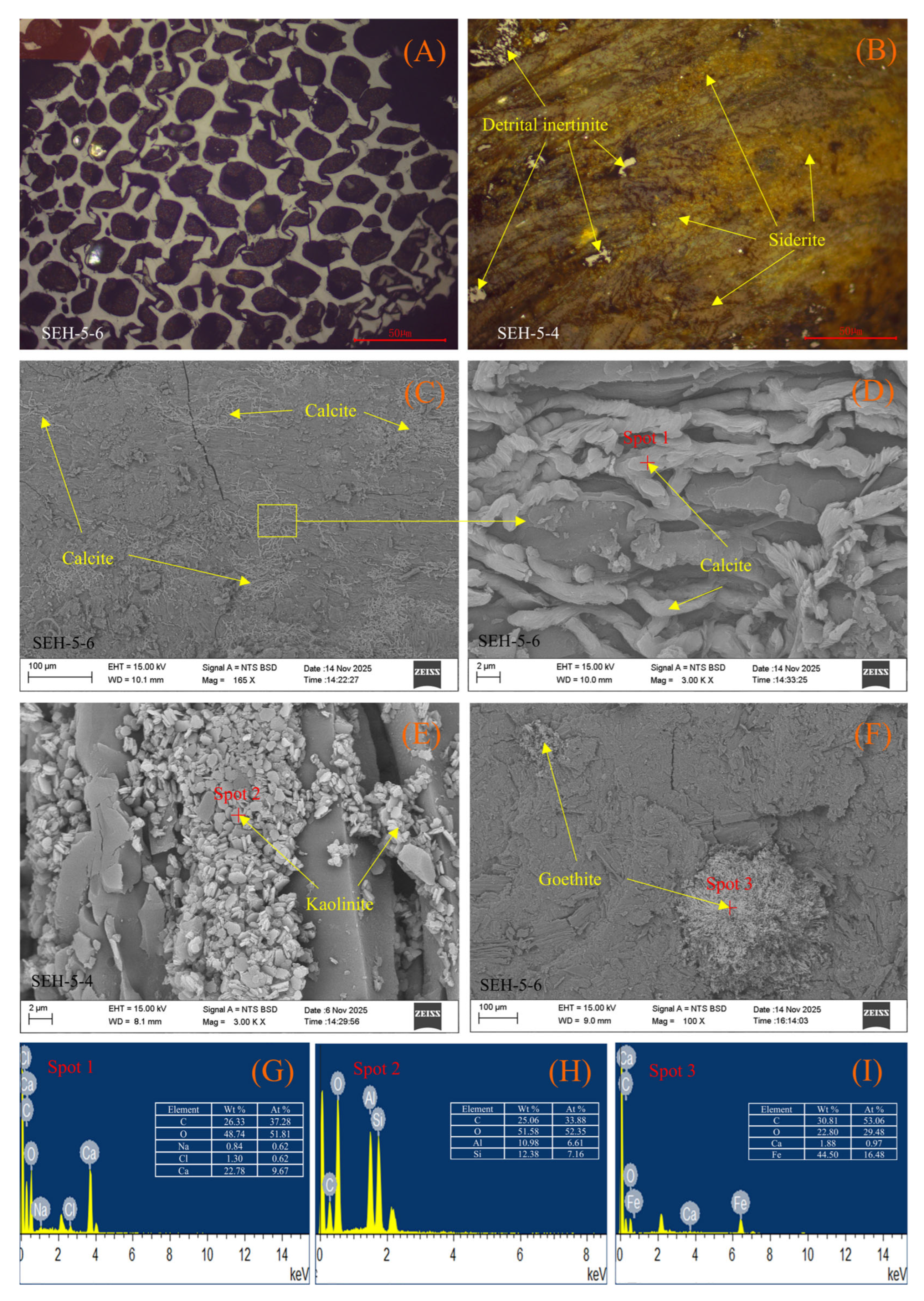 Figure 5. Optical micrographs, backscattered electron (BSE) images, and selected-point EDS spectra of minerals in the coal samples. (A) Clay minerals extensively filling sieve-textured fusinite (plant cell cavities); (B) Disseminated siderite occurring within coal matrix fractures, with minor detrital inertinite present; (C) vein-like calcite; (D) calcite infilling pores within the coal matrix; (E) kaolinite filling fractures in the coal matrix; (F) goethite embedded within the coal matrix; (G), (H) and (I) EDS spectra of Spot 1, Spot 2, and Spot 3, respectively.