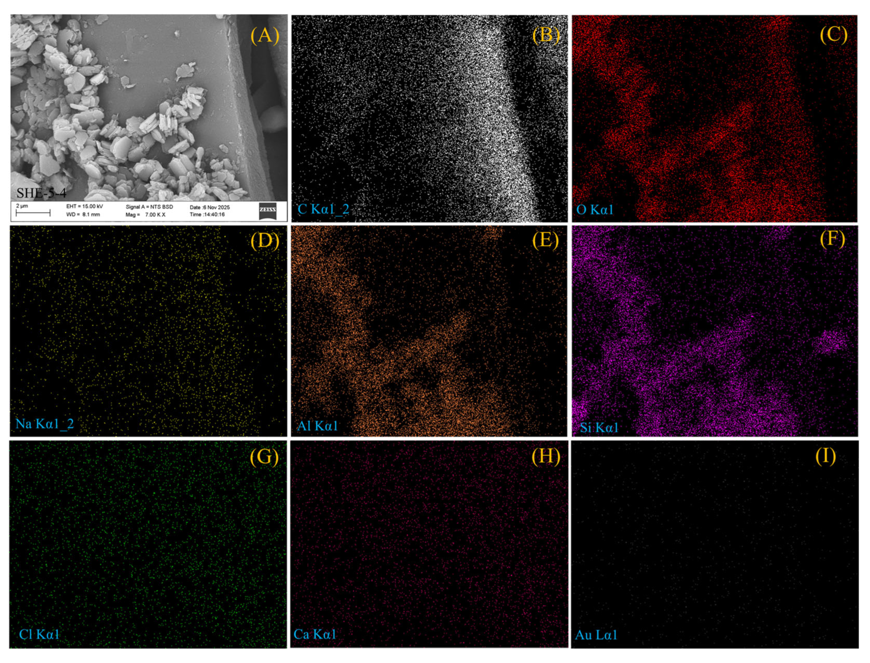 Figure 6. EDS area mapping spectra of a coexisting region of kaolinite and coal matrix. (A) Mapped area; (B), (C), (D), (E), (F), (G), and (H) represent the distribution of C, O, Na, Al, Si, Cl, and Ca elements within the scanned area, respectively; (I) Au element, from the gold coating during sample preparation.