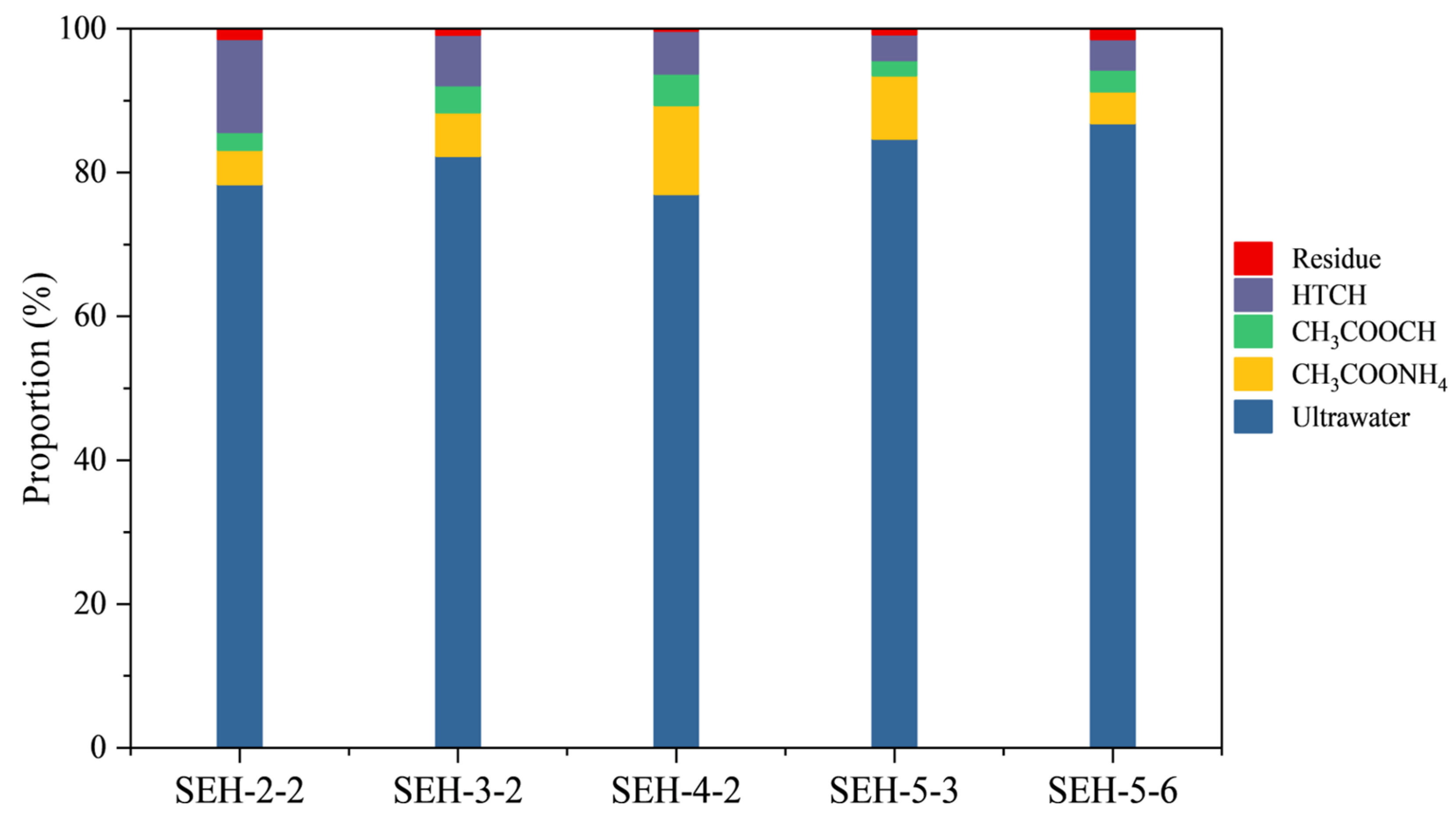 HTCP was performed similarly: the residue after the third extraction step was mixed with high-purity SiO2 in a combustion crucible, placed in an automatic sample carousel, and subjected to combustion hydrolysis under 1100 °C oxygen flow. The evolved gases were absorbed in NaOH solution and analyzed following the same procedure and calculation method.