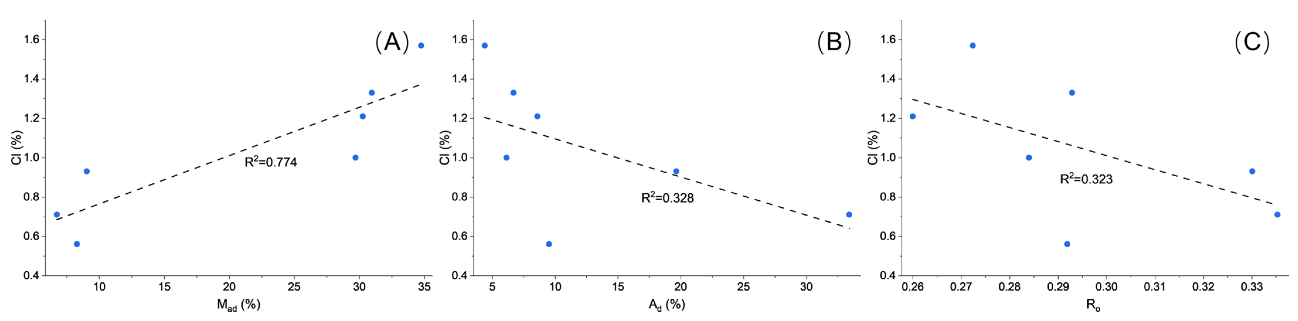 Correlation analysis between total chlorine content and coal properties (moisture, ash content, and random reflectance, Rr) reveals clear trends (Figure 8). Chlorine content shows a positive correlation with moisture and negative correlations with both ash content and Rr, indicating that chlorine preferentially associates with more labile, water-rich phases in coal. These water-rich phases mainly correspond to coal macerals with higher porosity and hydrophilic properties, such as vitrinite and associated microporous domains, which can retain inherent moisture. It is therefore likely that the elevated chlorine concentration reflects Cl ions associated with this inherent moisture, potentially derived from Cl-rich formation waters present during peat accumulation and subsequent burial. Overall, the speciation pattern of chlorine in the SEH coals can be summarized as: water-soluble Cl ≫ exchangeable/adsorbed Cl > organic/silicate-bound Cl > carbonate-bound Cl, highlighting the dominant role of water-soluble chlorine in the coal matrix and the subordinate contributions of other forms.
