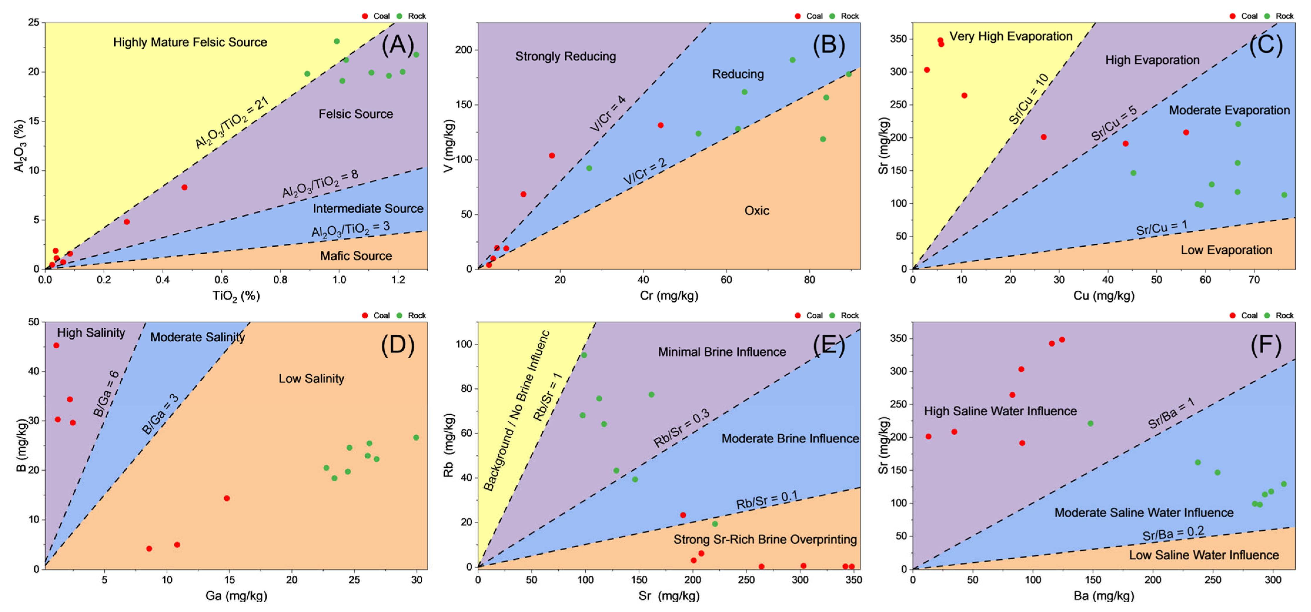 Figure 9. Geochemical indicators of the SEH coal seams. Colored intervals and in-figure labels indicate the corresponding depositional and post-depositional environmental characteristics. (A) Al2O3/TiO2 ratios of SEH coals and surrounding roof–floor mudstones, reflecting the provenance and maturity of detrital input; (B) V/Cr ratios of SEH coal samples, indicating redox conditions during peat accumulation; (C) Sr/Cu ratios of SEH coals and adjacent mudstones, used as an indicator of evaporation intensity and paleosalinity; (D) B/Ga ratios of SEH coals and surrounding rocks, reflecting the influence of saline or brackish water; (E) Rb/Sr ratios of SEH coals and roof–floor strata, indicating selective alteration by Sr-rich saline fluids; (F) Sr/Ba ratios of SEH coals and adjacent clastic rocks, reflecting saline water intrusion during diagenesis.