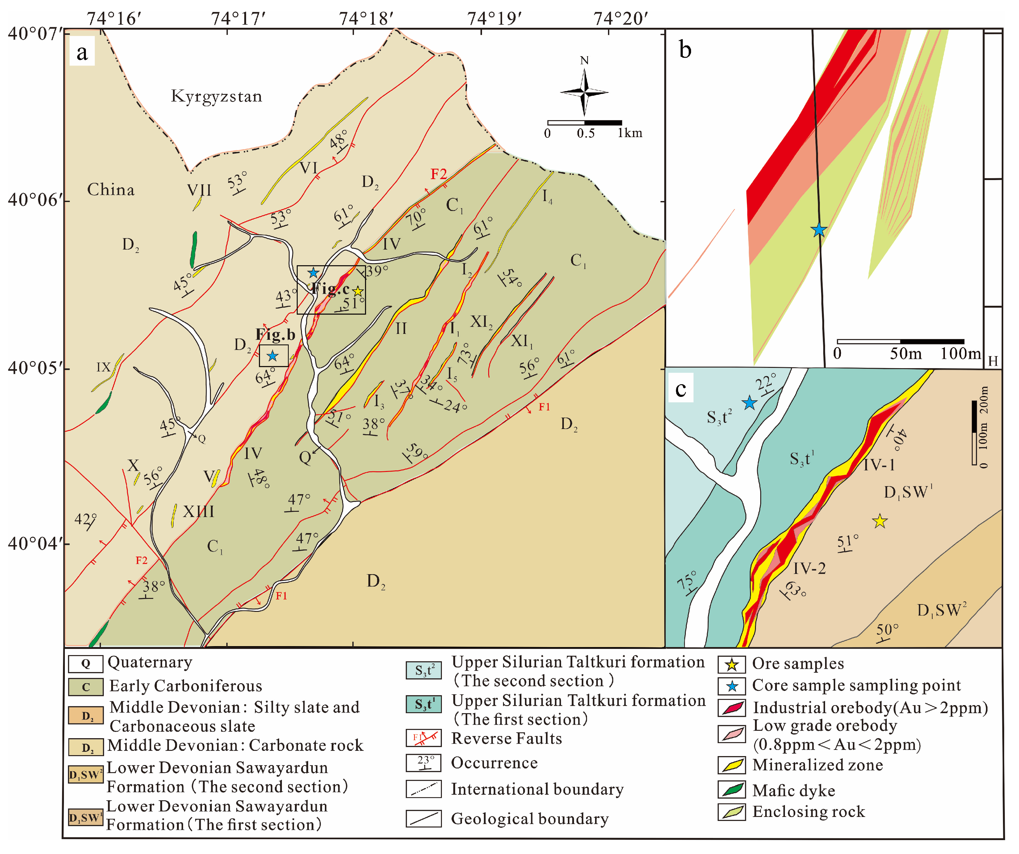 - Zhou, Z.J.; Chen, Z.L.; Zhang, W.G.; Zhang, T.; Zhang, Q.; Han, F.B.; Huo, H.L.; Yang, B.; Ma, J.; Wang, W.; et al. Structural deformation and fluid evolution associated with the formation of the Sawayardun gold deposit in Southwestern Tianshan Orogen. China Geol. 2022, 49, 181–200, (In Chinese with English abstract). [Google Scholar]