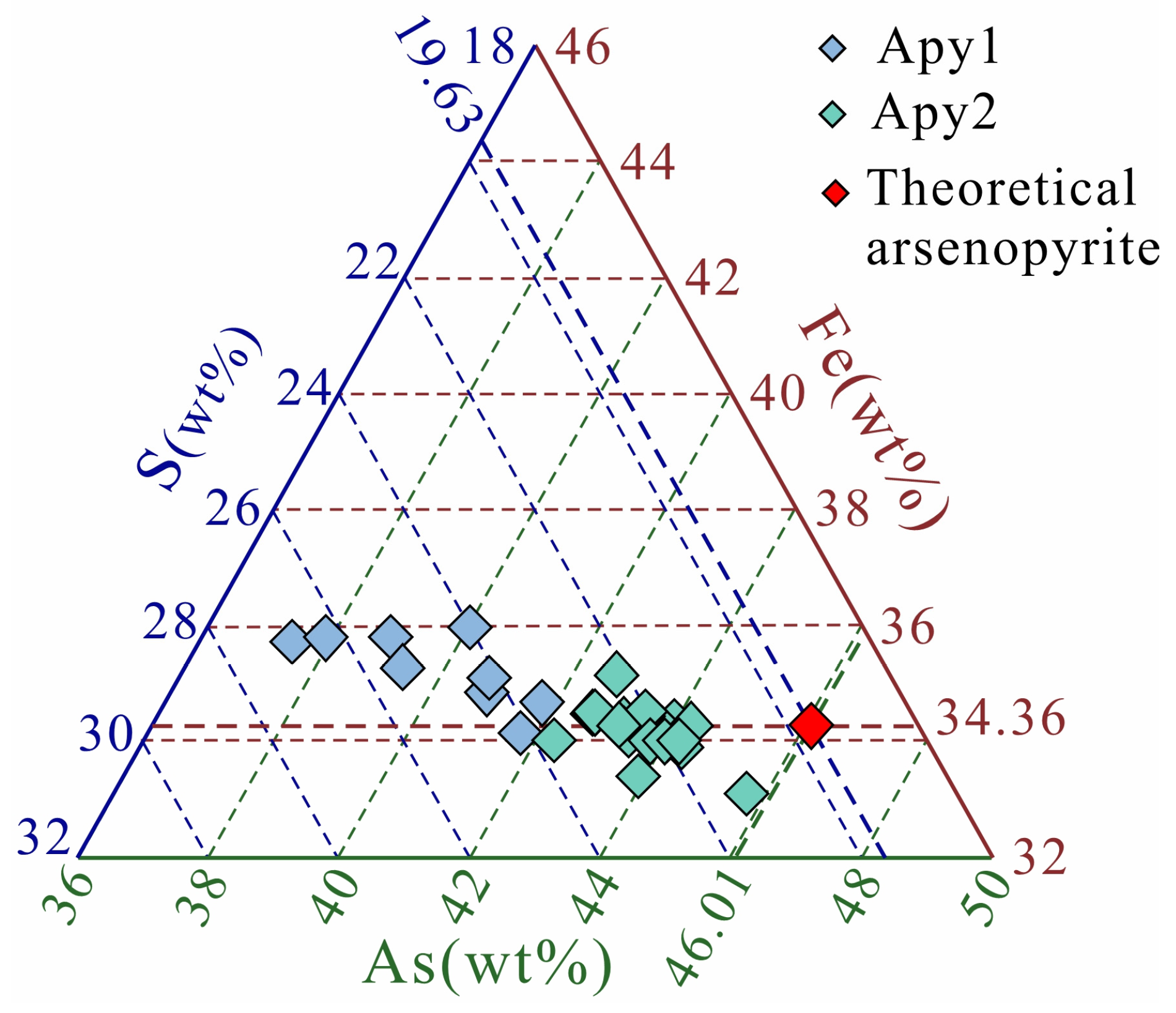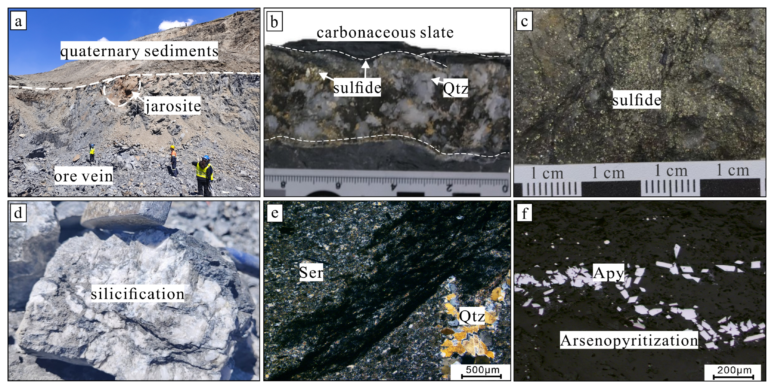 - Arsenopyrite–Pyrite Stage: This stage represents Phase II of hydrothermal activity, characterized by the occurrence of pyrite–arsenopyrite–quartz veinlets within carbonaceous host rocks (Figure 4g). Pyrite (Py2) and arsenopyrite are distributed within these quartz veinlets, whose widths vary significantly, ranging from a few millimeters to several tens of centimeters. Pyrite (Py2) occurs as anhedral grains with rough and porous surfaces (Figure 4h). The pores are often infilled by arsenopyrite, and the grains are overgrown by later-stage pyrite (Py3). Arsenopyrite (Apy1) exhibits euhedral to subhedral crystal forms, predominantly appearing as rhombohedra, prisms, and needles. The cores of arsenopyrite crystals are porous and are commonly overgrown by later-generation arsenopyrite (Apy2) (Figure 4i). The main gangue minerals are quartz and sericite.