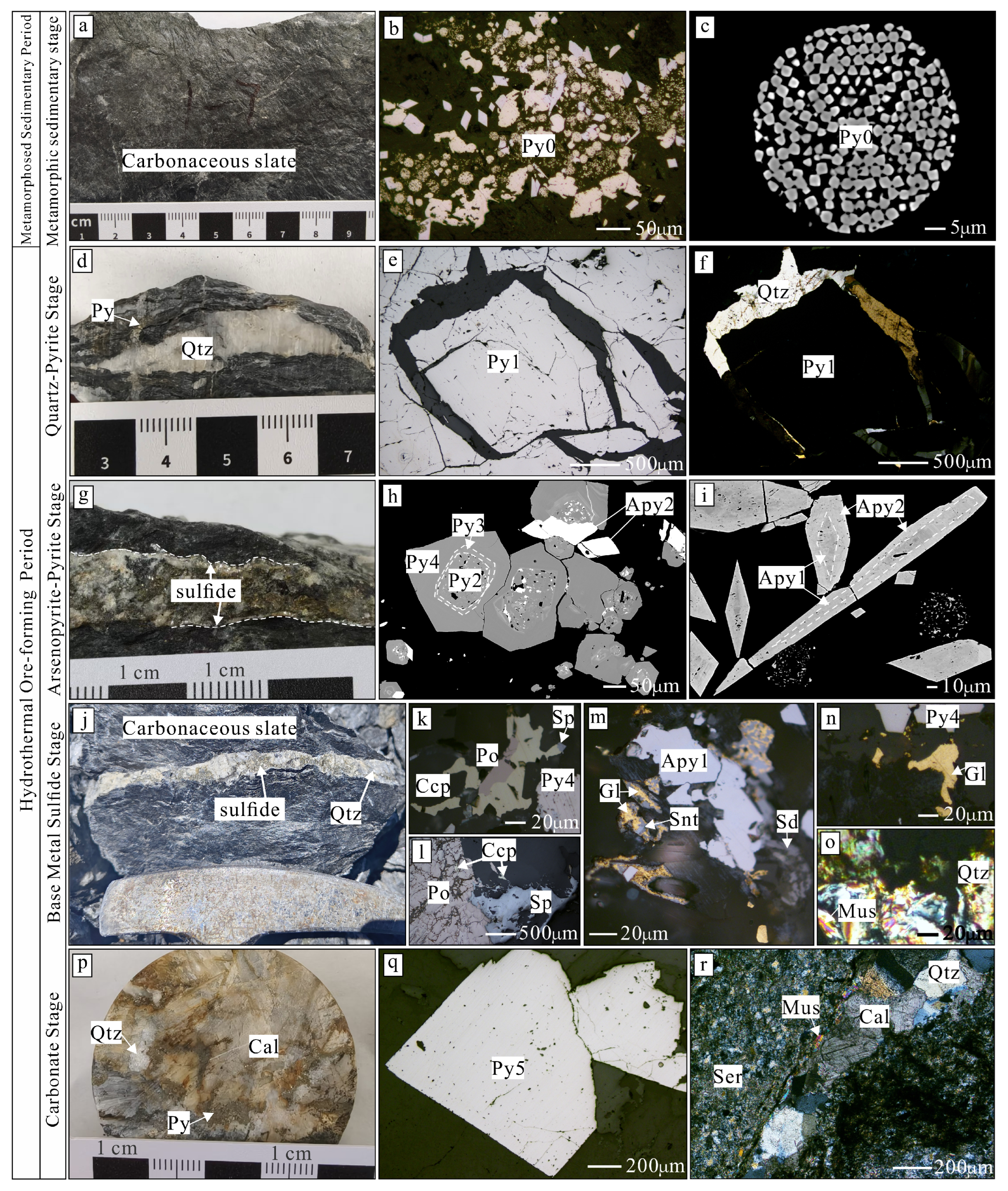 - Carbonate Stage: This stage represents Phase IV of hydrothermal activity and is characterized by the development of carbonate minerals (Figure 4p). Metallic minerals are sparse, with rarely observed sulfides consisting almost exclusively of pyrite. The pyrite occurring in this stage (Py5) is exceptionally coarse-grained, exceeding 500 μm in size, and forms euhedral crystals with well-developed morphology (Figure 4q). The gangue mineral assemblage, in addition to quartz and sericite, contains abundant calcite (Figure 4r).