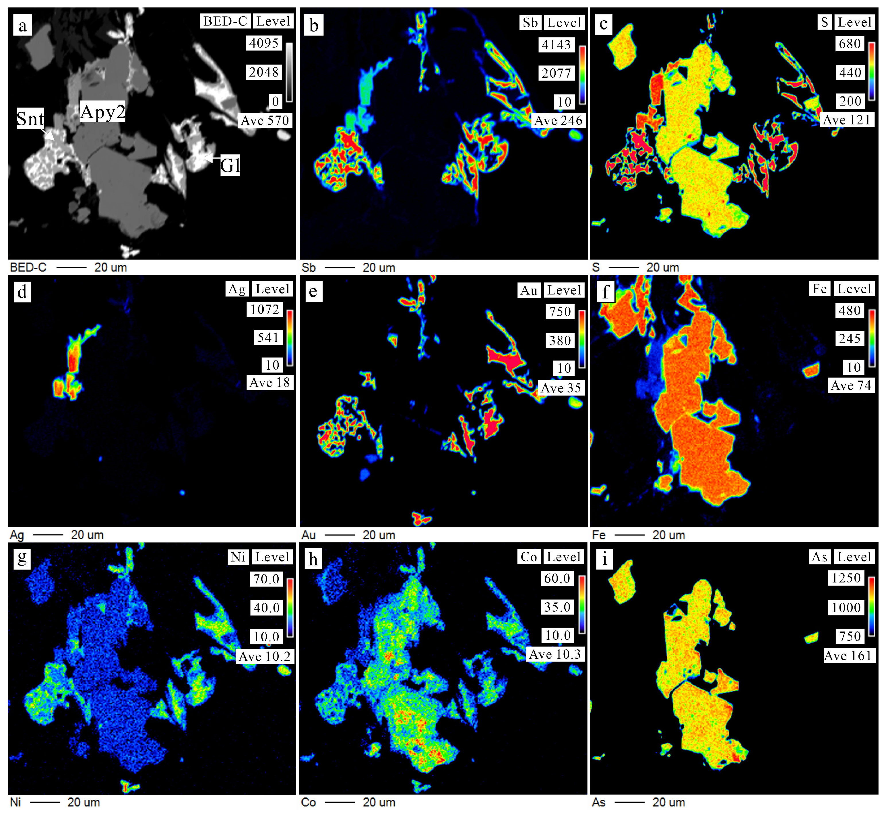 5.3. Chemical Composition of Arsenopyrite, Pyrite, Stibnite, and Gold