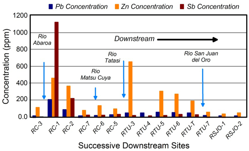 An example is provided by the Rio Chilco-Rio Tupiza drainage system of southern Bolivia. In this case, Pb, Zn, and Sb concentrations were used as geochemical tracers of mine contamination. Figure 1 shows that sediment from the Rio Abaróa, contaminated by an Sb mine, produced a geochemical trend extending from sampling site RC-3 to RC-5 that is expected from a single point source of contamination. Concentrations abruptly increase at the tributary mouth and then decline downstream. Villarroel et al. [] showed that the downstream declines could be attributed to a combination of hydraulic sorting of sulfide minerals from the mines, dilution, and sediment storage associated with channel bed aggradation. The downstream declines in concentration are abruptly altered at RTU-3 where Zn, and to a much lesser degree, Pb concentrations increase downstream of the Rio Tatasi. Since Sb concentrations did not increase downstream of the Rio Tatasi, the majority of the Pb and Zn at RTU-3 is unlikely to have been derived from the Sb mines. Concentrations of all three trace metals decrease downstream of the mouth of the Rio San Juan del Ore as a result of dilution by the influx of relatively “clean” sediment.