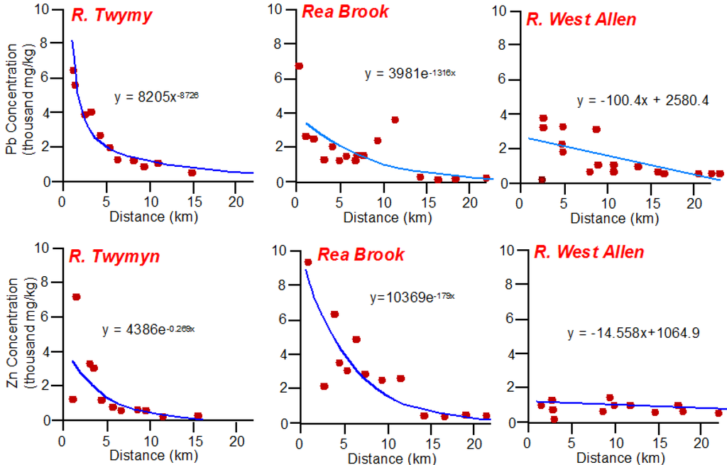 Downstream trends in Pb and Zn concentrations along the River Twymy, Rea Brook and West Allen in the UK. Solid lines represent the best-fit regression models, and show that concentrations tend to semi-systematically decrease downstream of a point source (figure modified from Lewin and Macklin [] as shown in Miller and Orbock Miller []).