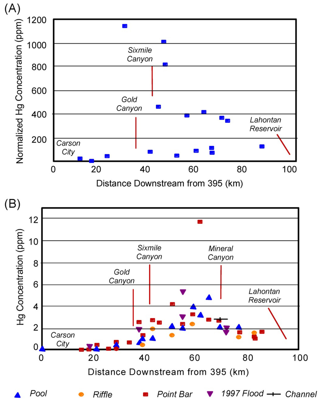(A) Downstream variations in Hg concentration normalized for silt and clay percent measured within the alluvial valley fill of the Carson River valley, western Nevada. Increased Hg concentrations occur in response to the influx of Hg from amalgamation processing mills. Variations result from distance from mills of sampling sites, age of stratigraphic units relative to Ag/Au production and Hg influx, hydrologic conditions at time of deposition and other factors; (B) Downstream variations in Hg concentration within channel bed sediments. Concentrations within the modern channel sediments gradually increase as contaminated materials are eroded from the channel banks. The decline in concentration results from the influx of “clean” sediments from tributaries and from the erosion of uncontaminated bank materials (modified from Miller et al. []).