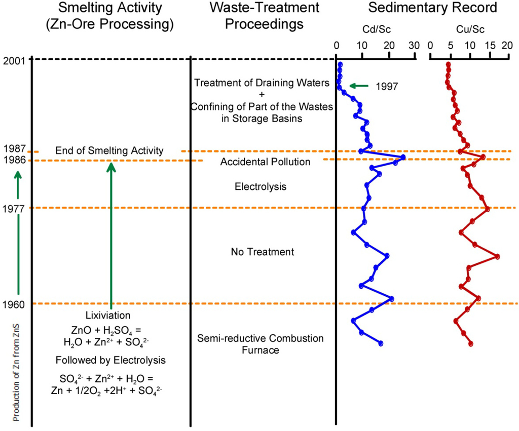 Vertical (depth) variations in Cd/Sc and Cu/Sc ratios within samples from a dated sediment core extracted from the Cajarc reservoir, located along the Lot River, France. Variations reflect changes in Cu and Cd influx to the river in response to alterations in processing methods and, after 1987, remediation efforts (modified from Audry et al. []).