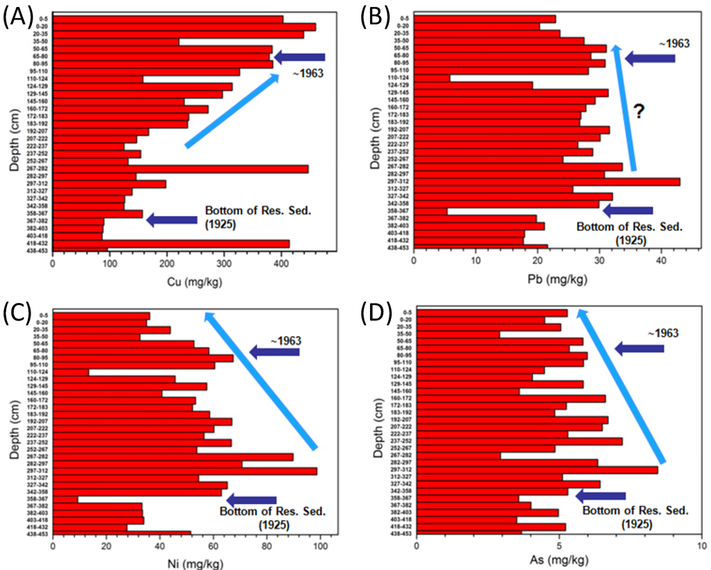 Vertical (depth) variations in Cu (A), Pb (B), Ni (C), and As (D) concentrations within samples collected from a sediment core extracted from Lake Emory along the Upper Little Tennessee River, western North Carolina. Pb, Ni, and As concentrations decrease from 1925 to present. High values correlate with the erosion of metal enriched subsoils during land-use change. In contrast, Cu loadings to the river have increased since dam closure in 1925 in response to the use of Cu based pesticides within the watershed (from Miller and Mackin []).