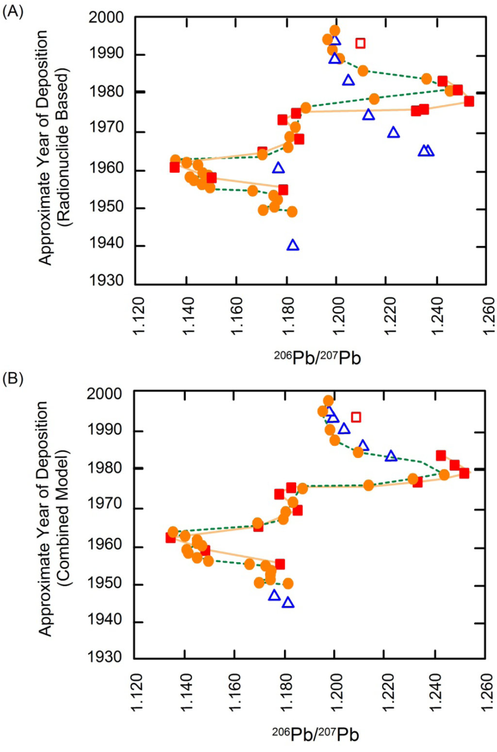 Vertical (temporal) trends in 206Pb/207Pb ratios within three cores obtained from reservoirs at three different locations along the upper Hudson River. Red squares represents samples from mile post (mp) 188.5 (upstream), orange circles from mp 163.6 (downstream), and open blue triangles from samples collected at mp 169 in 1995 (A). Sediment ages are assigned ages on basis of 137Cs data. Vertical trends in 206Pb/207Pb are similar between the three sites, but are offset vertically. (B) Temporal trends based on both 137Cs data and chemostratigraphic correlation on the basis of 206Pb/207Pb ratios between the sites so that the in 206Pb/207Pb trends match (from Chillrud et al. []).