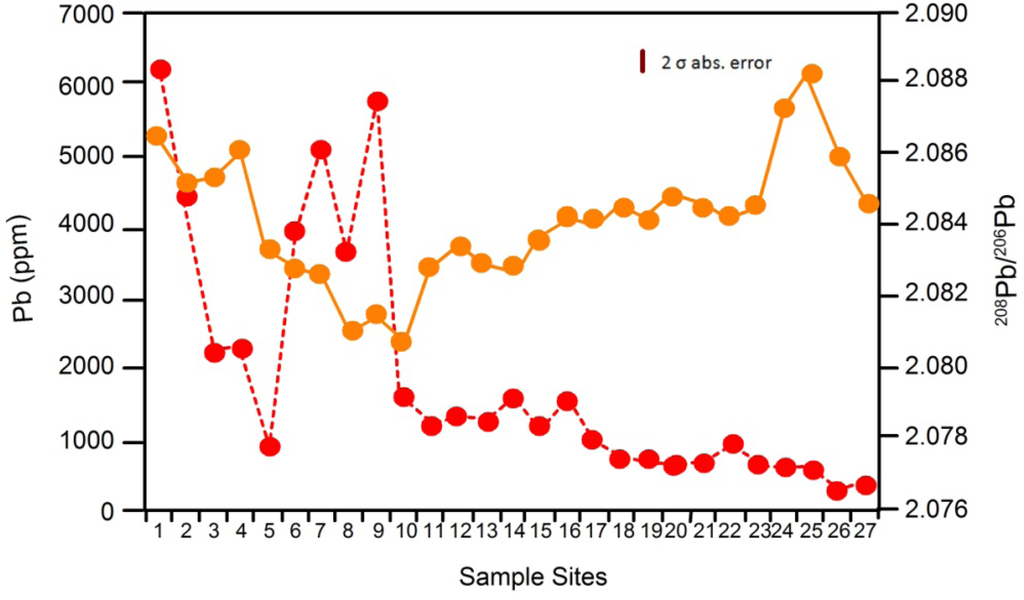 Downstream changes in total Pb concentration (red circles) and 208Pb/206Pb ratios (orange circles) along the River Wear, Northern England. Sample sites 1 through 27 are shown on ordinal axial and cover a distance of 86.5 km. Error bar refers to isotopic measurements (from Shepherd et al. []).