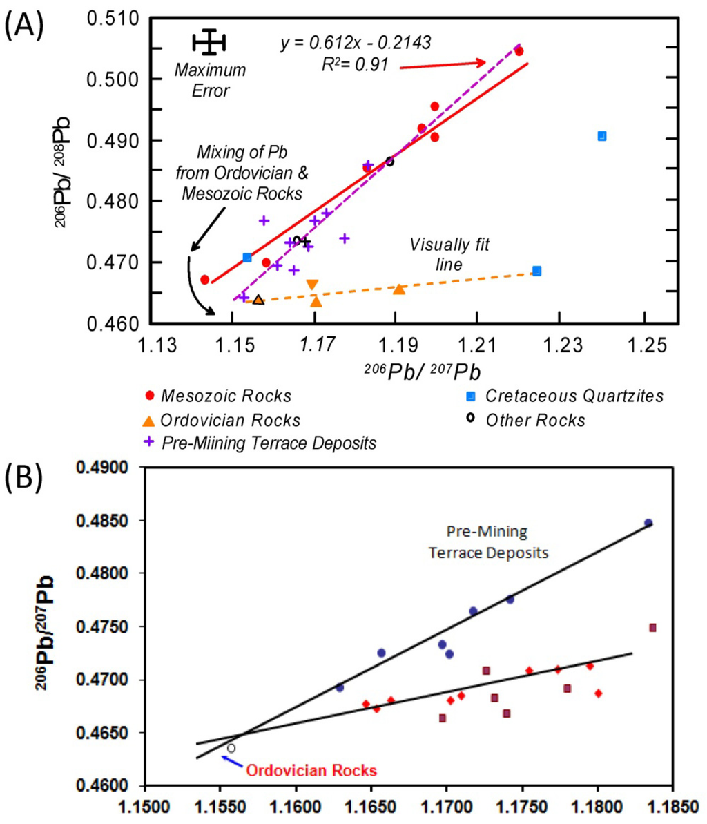 (A) Pb isotopic ratios measured in pre-mining (and uncontaminated) terrace deposits (purple line) vs. those measured within Ordovician, Mesozoic and Cretaceous rocks. Pre-mining terrace deposits appear to be composed of sediment from Mesozoic rocks with relatively high Pb ratios and Ordovician rocks (from Miller et al. []). (B) Pb Isotopic data collected in 2000 from modern channel bed (red circles and brown squares). High ratio end member is consistent with isotopic values obtained from ore deposits mined and milled from Cerro Rico, indicating Pb is derived from the mines and the underlying rocks (particularly Ordovician Rocks (From Miller et al. []).