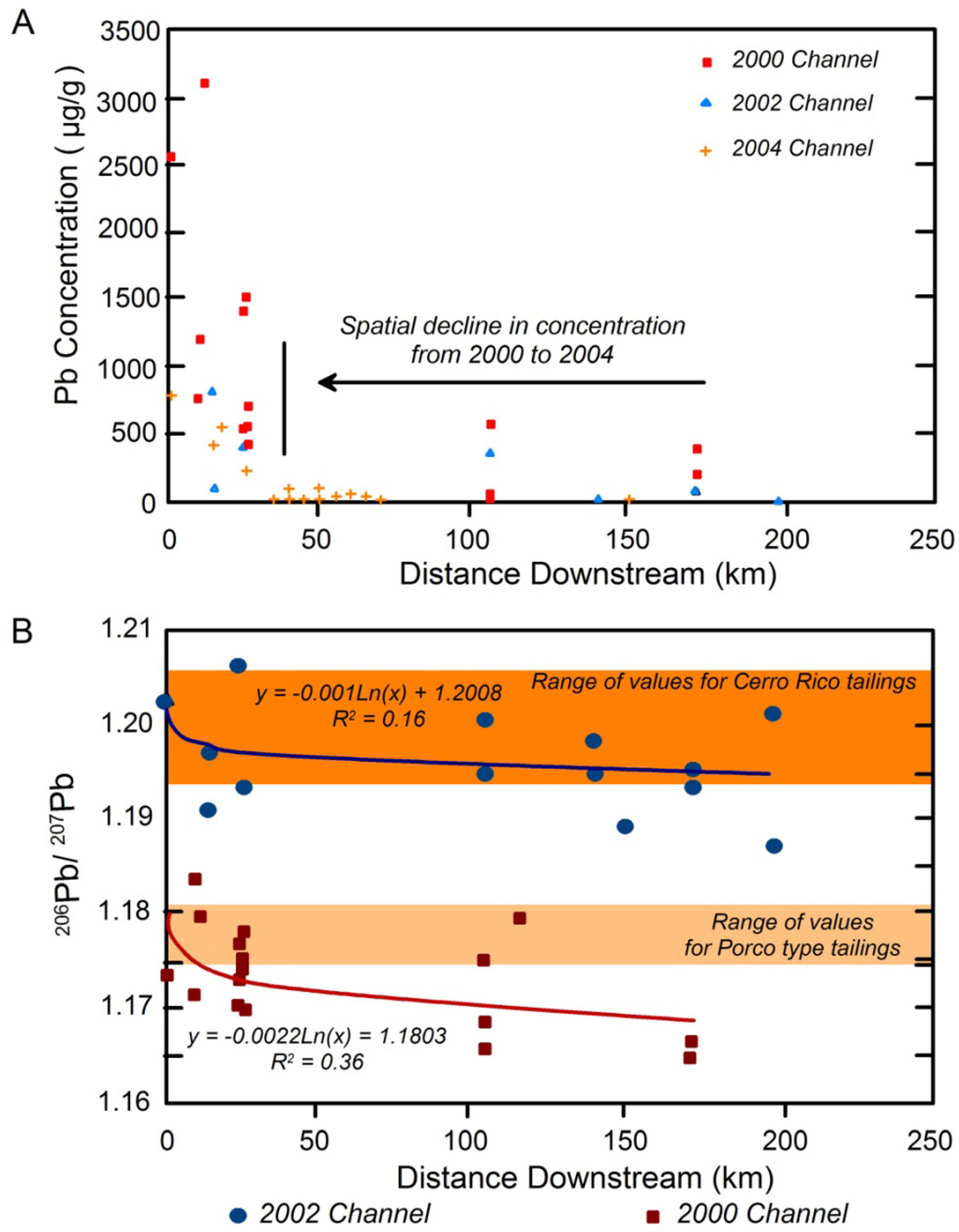 Another interesting observation from along the Rio Pilcomayo is that 206Pb/207Pb values within samples collected from the lower channel tended to decrease downstream toward the values observed within the Ordovician rocks. In contrast, 206Pb/207Pb ratios measured in samples collected in 2002 showed no downstream trend; rather, the 206Pb/207Pb ratios were either indistinguishable from the ratios within the Cerro Rico type ore deposits, or fell between the two types of ore deposits (Figure 10). The change in spatial patterns of the isotopic ratios was coincident with a decrease in: (1) Pb concentrations at any given location along the channel; and (2) the downstream extent of highly elevated Pb concentrations (Figure 10a). Miller et al. [] suggest that the observed changes in Pb concentration and Pb isotopic values reflected annual differences in system hydrology and upland sediment inputs to the river. During wet years, such as 2000, the highly dynamic nature of the Rio Pilcomayo allowed larger quantities of Pb-contaminated sediment from the mines and mills to be transported downstream over longer distances, resulting in relatively high Pb concentrations. However, the proportion of the Pb derived from the mines decreased downstream, as indicated by the isotopic ratios, because significant quantities of uncontaminated fine-grained sediments were eroded from upland areas and delivery to the channel via tributaries as a result of significant runoff. During dry years, such as 2002, the transport of Pb-contaminated sediment from the mines and mills is reduced decreasing the overall concentrations within the alluvial bed sediments. However, because there is much less sediment eroded from the surrounding uplands and delivered to the channel during the dry years, most of the Pb found in the channel is derived from the upstream mining operations. The study by Miller et al. [] demonstrates that the source of Pb to the channel can vary over relatively short timeframes (i.e., a year) as a function of the hydrology and sediment transport processes that characterize dynamic catchments. To date, very few studies have examined these types of short-term variations in isotopic signatures within alluvial sediments, and the topic clearly requires additional attention.