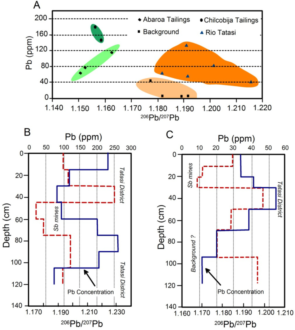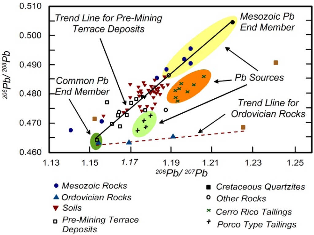 Miller et al. [,], for example, used bivariate scatter diagrams for 206Pb/207Pb and 206Pb/208Pb to assess the sources and contaminant transport processes along the Rio Pilcomayo downstream of the Cerro Rico de Potosi precious metal-polymetallic tin deposits of Bolivia. Mining of the deposits has continuously occurred since 1545 and the river is severely contaminated by a wide-range of trace metals [,]. Miller et al. [] found that (1) the 206Pb/207Pb and 206Pb/208Pb ratios differed between bedrock units within the catchment, and (2) alluvial sediments collected from pre-mining terrace deposits formed a mixing line defined by the isotopic ratios of Ordovician and Mesozoic rocks. In contrast, samples collected in 2000 from the highly contaminated channel bed exhibited a significantly different trend (Figure 9) in which the isotopic end members were formed by the Ordovician rocks and mine/mill processing waste from the operations at Cerro Rico. In 2000, then, the channel bed material was dominated by natural Pb from the underlying Ordovician rocks and Pb from the ore deposits that were released anthropogenically into the river system. Pb input from the Mesozoic rocks was apparently minor and the isotopic signature was masked by the large inputs from the other two sources.
