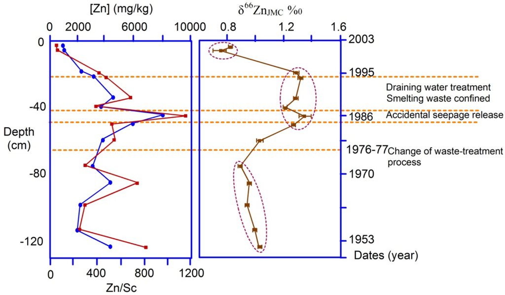 - Sivry, Y.; Riotte, J.; Sonke, J.E.; Audray, S.; Schäfer, J.; Viers, J.; Blanc, G.; Freydier, R.; Dupré, B. Zn isotopes as tracers of anthropogenic pollution from Zn-ore smelters, The Riou Mort-Lot River System. Chem. Geol. 2008, 255, 295–304. [Google Scholar] [CrossRef]