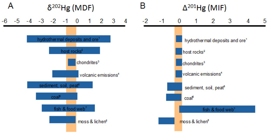 - Biswas, A.; Blum, J.D.; Bergquist, B.A.; Keeler, G.J.; Xie, Z.Q. Natural mecury isotope variation in coal deposits and organic soils. Environ. Sci. Technol. 2008, 42, 8303–8309. [Google Scholar] [CrossRef]