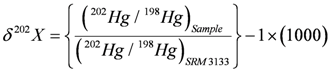 - Blum, J.D.; Bergquist, B.A. Reporting of variations in natural isotopic compositions of mercury. Anal. Bioanal. Chem. 2007, 388, 353–359. [Google Scholar] [CrossRef]