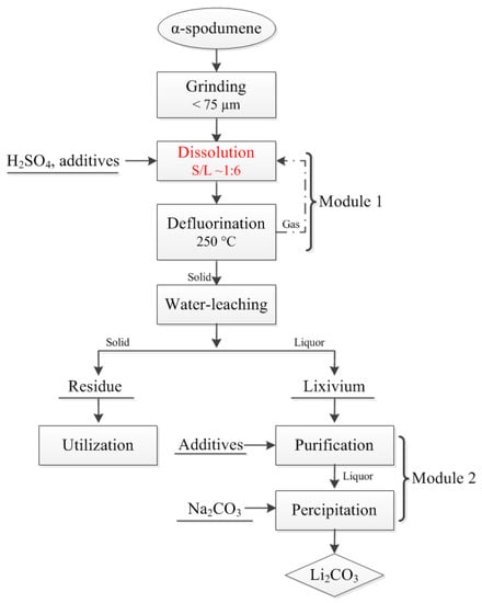 Spodumene (LiAlSi2O6), has attracted a great deal of interest as one of the most important commercially-applicable lithium ores due to its high theoretical lithium content (up to 8.03% (wt %) Li2O) [7,8]. Various processes, including traditional acid or alkaline digestion, or the recently-proposed roasting using sodium or calcium salts via ion exchange, have been reported to successfully extract lithium from spodumene [9,10,11,12,13]. These extraction processes are generally divided into two modules (Figure 1): One is to transfer lithium into lixivium via dissolution or leaching; while, the other is separation and purification before concentration and conversion to Li2CO3 or other lithium products. The purification principles of module 2 are similar in that pH is often adjusted to precipitate iron, calcium, magnesium, or other metal ions, while in module 1, pretreatments, like calcination at > 1000 °C, are usually used to transform α-spodumene into a much more reactive β phase, as the crystal structure of the α phase is compact and resistant to almost all chemical agents, causing a great deal of energy consumption. More effective strategies should be developed to maximize lithium leaching and reduce production costs.