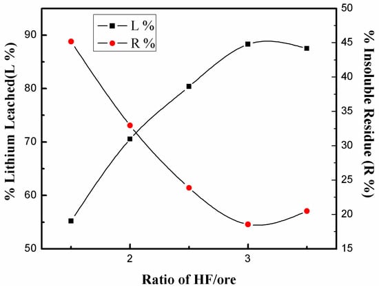 The dissolution processes of feldspar or sandstones in HF or HF/HCl mixtures indicated that the reactions were limited by hydrofluoric acid absorbing onto the mineral surface and forming highly-stable complex fluorides, such as fluorosilicates and fluoroaluminates, due to the outstanding electronegativity of F [17,18,19]. Experiments using different ore/HF (Figure 2) showed that the leaching efficiency of lithium increased with the increase in HF/ore ratio. About 90% of the lithium leached when ore/HF ratio was 1:3, approximating the stoichiometric ratio according to Reaction (3).