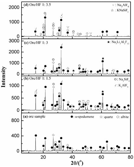 However, the increase in ore/HF ratio to 1:3.5 caused a decrease in L% and an increase in R%. The XRD analysis of the residues obtained with ore/HF ratio of 1:3.5 (Figure 3d) showed that more fluorosilicates, such as KNaSiF6 (JCPDS 43-1313) and Na2SiF6, were generated. Additionally, XRD analysis showed that the peak intensities of quartz decreased. The detection of KNaSiF6 (JCPDS 43-1313) at ore/HF ratio less than 1:3, indicates the cleavage of Si–O and dissolution of which is unfavorable due to a high concentration of HF. Rosales [12] deemed that albite starts to dissolve if the amount of HF is over the required stoichiometric ratio, according to Reaction (3). However, peaks of cryolithionite (Na3Li3Al2F12) (JCPDS 22-0416) were generated, even at HF additions under the stoichiometric value. Thus, the selective dissolution of α-spodumene over albite did not take place due to two reasons: (i) the low reactivity of α-spodumene, and (ii) the dissolution process was coupled to the dissolution of albite. However, selective dissolution could still be achieved to a certain extent as the dissolution of quartz can be limited by adjusting the amount of added HF. When considering the leaching efficiency of lithium, along with the efficient utilization of HF, the suitable ratio of ore/HF that could be added was determined as 1:3 (g/mL), and approximated the stoichiometric ratio of Reaction (3).