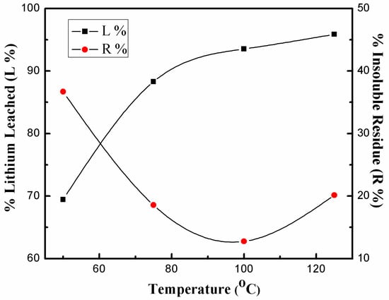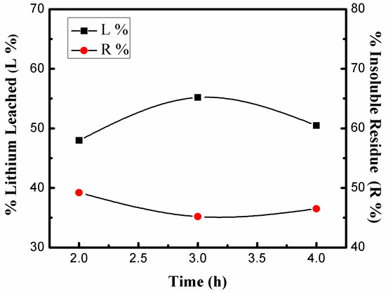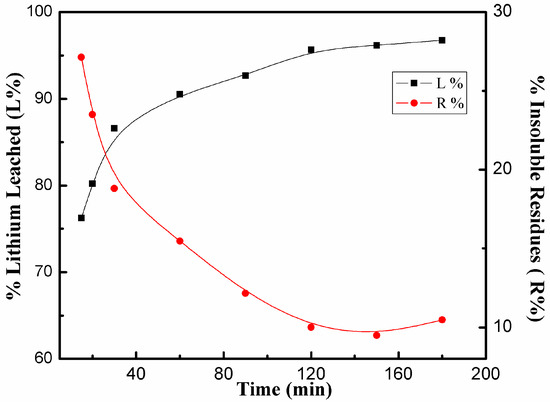 The leaching efficiency of lithium (L%) and the percentage of insoluble residues (R%) calculated based on Equations (1) and (2) were used to evaluate the efficiency of the reaction system.