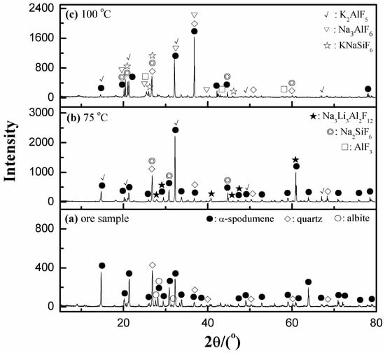 Experiments were conducted under different dissolution temperatures, from 50 to 125 °C; Figure 4 shows that lithium leaching accelerated with increasing temperature. However, the XRD analyses of the residues in Figure 5 show that different phases were detected at different temperatures. For instance, typical peaks of Na3Li3Al2F12 at 60.9° were detected at 75 °C, but not at 100 °C, indicating that the formation of residues was dramatically influenced by the temperature. In other words, temperature could influence complexing among ions, such as Li+, Al3+ with F−, which are insoluble fluorides, such as Na3Li3Al2F12, K2AlF5, or AlF3, and were generated under different temperatures (Figure 5). Therefore, the dissolution temperature should be strictly controlled due to its significant effect on dissolution behavior. The residue obtained at 125 °C was viscous and could not be compressed for XRD analysis. When considering that the azeotropic system of the HF/H2O mixture has a boiling point of 113 °C [23], the dissolution temperature should not exceed 113 °C. Therefore, a suitable temperature of 100 °C was employed to conduct the dissolution process.