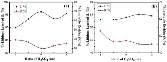 Effects of H2SO4/ore ratio on the dissolution process: (a) ore/HF 1:3; (b) ore/HF 1:1.5 (75 °C, 150 rpm, 3 h).