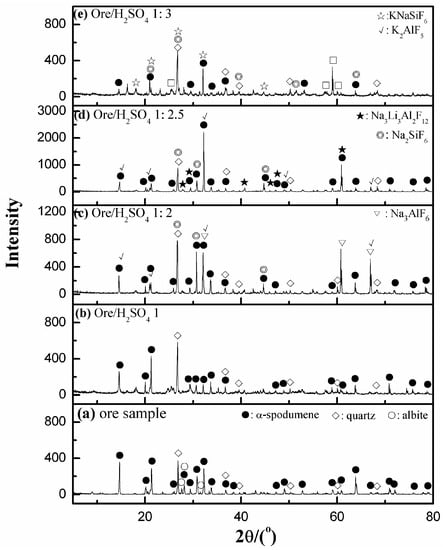 Figure 6 shows that the increase of H2SO4 promoting lithium leaching (L %), at with sufficient (Figure 6a) or insufficient (Figure 6b) HF was added, according to the stoichiometric of Reaction (3). The leaching efficiency of lithium reached a relative maximum when the ratio of ore/H2SO4 was 1:2. The dissolution of the generated insoluble fluorides by H2SO4 takes place due to the release of release of some HF, which slightly accelerates the dissolution according to Reaction 5. However, the release of HF caused more Al3+, Na+, K+, or even Li+ to be involved in a competition for complexing with F−, causing a certain degree of fluctuation in the leaching efficiency of Li (Figure 6a). This assumption could also be verified by the percent of insoluble residues in Figure 6a. Moreover, the XRD analysis (Figure 7) also indicated that higher H2SO4 affected the compositions of intermediates, especially for the complex formed between Al and F. The formation of Na3Li3Al2F12 with a ratio of ore/H2SO4 of 1:2.5 resulted in a decreased leaching efficiency of lithium. Moreover, enhanced the generation of fluosilicates, such as KNaSiF6, were not beneficial for the utilization of HF. A suitable ore/H2SO4 ratio was, therefore, selected as 1:2 to maximize the leaching efficiency of lithium and efficient usage of HF. Additionally, it should be mentioned that the effect of H2SO4 on lithium leaching was not obvious (Figure 6b) when there was insufficient HF, confirming the conclusion that the degree of dissolution was mainly determined by ore/HF ratio.