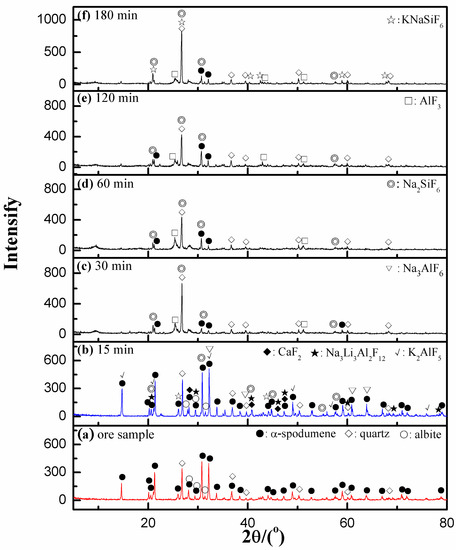 The results in Figure 9 showed that the dissolution proceeded to completion as the time increased. The XRD analyses (Figure 10) showed that α-spodumene and albite in the ore sample were gradually dissolved, and that some insoluble fluorides were formed. Typical peaks of quartz remained even after a 3 h leaching period, which indicated that selective dissolution was achieved to a certain extent, and that α-spodumene and albite were preferentially dissolved over quartz. Based on the XRD analysis, we concluded that an extended dissolution time >30 min had a slight effect on lithium leaching due to the fact that differences in the diffraction peaks did not vary obviously from 30 to 180 min. About 85% of the lithium was leached at 30 min; therefore, the dissolution time should last longer than 30 min but not exceed 3 h to maximize lithium leaching and utilize HF efficiently, which was consistent with our previous investigations on the time effects on lithium leaching efficiency in Section 3.3.4.