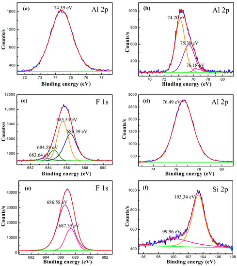 The Al 2p spectrum of residues at 180 min, fitted at 76.49 eV of Al–F [25] (Figure 11d), which was obviously different from 74.39 eV of Al–O contained in the ore sample (Figure 11a) [26]. The three peaks at 74.20, 75.38, and 76.18 eV were fitted with the Al 2p spectrum at 15 min (Figure 11b). Moreover, curves of K–F (683.64 eV), Al–F (685.53 eV), Li–F (686.39 eV) and Ca–F (684.58 eV) were fitted with the F 1s spectrum at 15 min (Figure 11c) [27,28,29,30]. In addition, peak area ratios among K–F, Li–F and Al–F were 0.09:0.82:1; therefore, it can be concluded that aluminum was partially fluorinated at 15 min. As for the F 1s spectrum of residues at 180 min (Figure 11e), two peaks of Al–F and Si–F in Na2SiF6 [31] were fitted. The Si–F bond was fitted with the spectrum of Si 2p at 180 min, except for some unreacted Si–O [32] (Figure 11f).