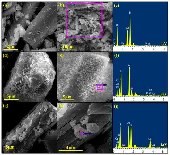 SEM and X-ray spectrometer (EDX) images of residues under different dissolution times: (a–c) ore sample; (d–f) 15 min; (g–i) 30 min; (100 °C, ore/HF/H2SO4 1:3:2, 150 rpm).