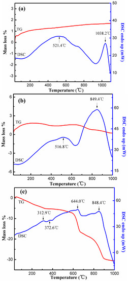 The thermal decomposition behavior was investigated in an N2 atmosphere (40 mL/min) using TG-DSC, which was important for both confirmation of generated intermediates and comprehensive utilization of insoluble residues. The TG analysis of the ore sample showed that an obvious endothermic peak (Figure 13a) occurred at 1038.2 °C due to a phase transformation from α-spodumene into the β phase [9]. The phase transformation occurred at 849.4 and 848.4 °C, in residues at 15 min (Figure 13b) and 180 min (Figure 13c), respectively, which could be attributed to the partially-destroyed crystal structure, resulting in a much easier phase transformation at about 800 °C. The endothermic peaks at 521.4 °C of the ore sample, and 516.8 °C of the residues, at 15 min, belonged to the phase transform of albite. The endothermic peaks at 312.9 and 372.6 °C at 180 min could be distributed to the decomposition of Na2SiF6 and KNaSiF6 [33]. The mass decrease at 644.0 °C was mainly caused by the decomposition of AlF3 [34]. The thermal decomposition behaviors were consistent with our speculation on the generated intermediates. The subsequent process of defluorination and utilization of the insoluble residues should pay attention to the temperature.
